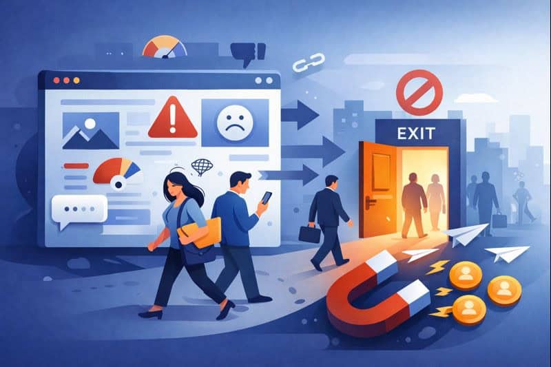 Visual idea: A simple illustration showing a visitor entering a website and turning away due to issues like slow speed, cluttered layout, unclear messaging, and missing trust signals.